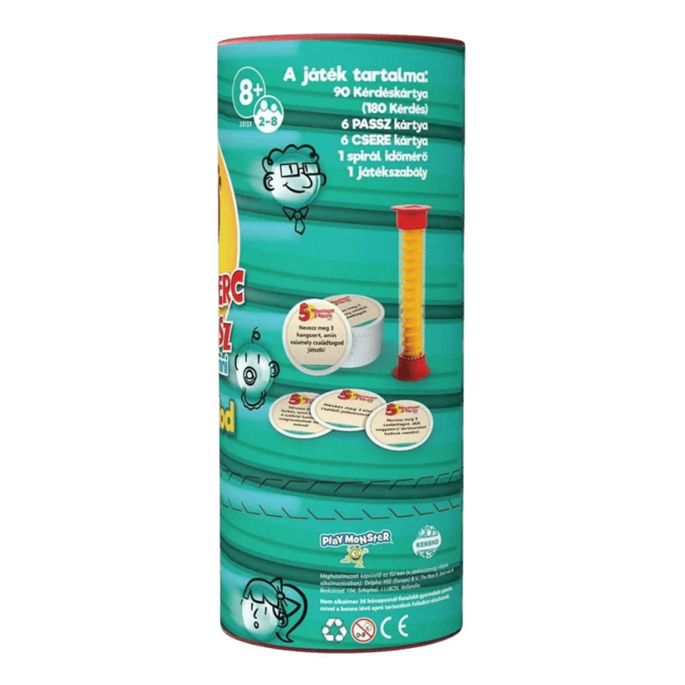 Szeretnéd megtudni, mennyire ismered a családtagjaidat? Az izgalmas és pörgős 5 másodperc, 3 válasz társasjáték garantáltan nevetést hoz a családi összejövetelekre! Ez a mini játék fantasztikus szórakozást nyújt minden korosztálynak, miközben közelebbről megismerheted szeretteidet. Minden játékosnak csupán 5 másodperce van válaszolni a kérdésekre, amelyek a család bármely tagjára vagy jellemvonására vonatkoznak. Ha valaki nem tud válaszolni időben, passz vagy csere kártyákkal átugorhatja a kérdést. A játék dinamikáját a spirál időmérő biztosítja, amely folyamatosan fenntartja az izgalmat. A rendelkezésre álló 180 kérdés és változatos kártyák szavatolják, hogy a játék hosszú távon is élvezetes maradjon. Készen állsz, hogy megtudd, ki ismer jobban a családodból? Játékosok száma: 2-8, életkor: 8+ év.