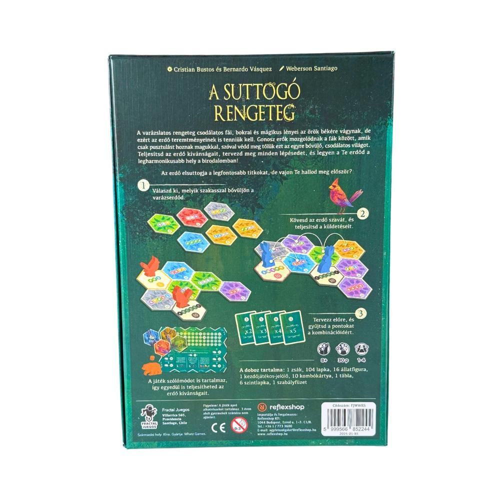 9A suttogó rengeteg9 egy varázslatos társasjáték, amelyben 9szellemállatok9 harmóniában élnek, miközben megvédik az erdőt különböző küldetések teljesítésével. A játék során 9gondosan kell tervezned9 az útvonalakat és az erdőd növekedését, hogy a legtöbb pontot szerezz a végén. A játék előre nem meghatározott számú fordulóból áll, minden körben lehetőséged van új lapkákat húzni és kompletálni a küldetéseket. A 9játék végét9 két módon lehet elérni: ha valaki teljesíti a kezdettől kitűzött küldetésmennyiséget, vagy ha a zsákban elfogynak a lapkák. Az izgalmas játékmenetet a következő elemek biztosítják:
