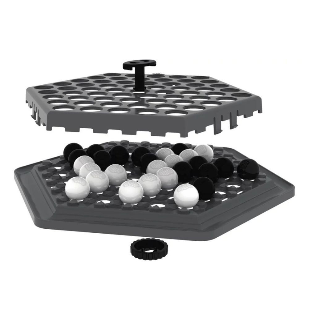 Kíváncsi vagy, milyen, amikor a golyók súlya és az elme gyorsassága dönt el mindent? Az Abalone Go játékban két játékos párbajozik egymással, céljuk pedig, hogy kilökjék a másik hat golyóját a pályáról. A játékosok fekete vagy fehér golyókkal játszanak. A játékmenet során egy, kettő vagy három egymás melletti golyót mozgathatsz előre, hátra vagy oldalirányban. Erősebb sorként eltolhatod az ellenfél golyóit, és így szoríthatod ki őket a pályáról. A hatszögletű játéktábla lehetővé teszi, hogy változatos taktikákat és csapdákat alkalmazz. Legyél előrelátó, és készülj fel a váratlan lépésekre! A doboz tartalma: