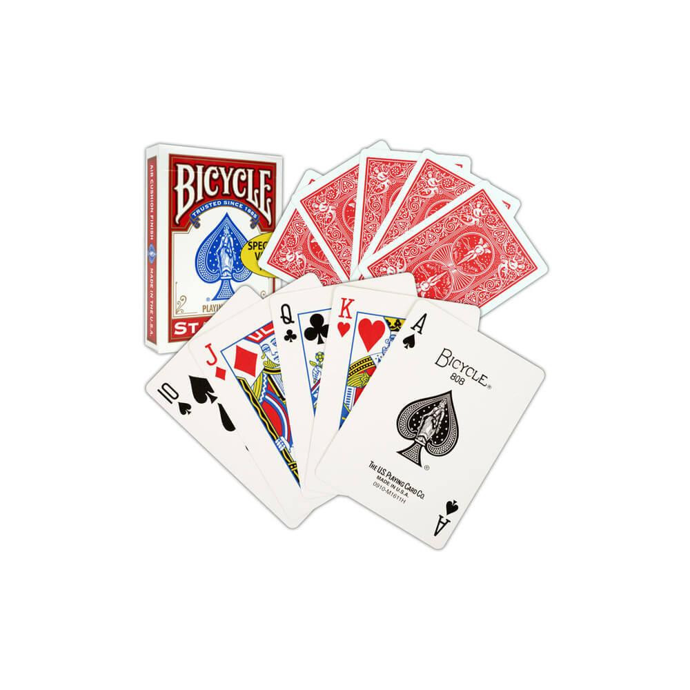 A Bicycle Rider Back minőségi, papír póker kártya dupla csomagja ideális választás mindenkinek, aki szereti a jó minőségű kártyákat. 1885 óta a legnagyobb darabszámban eladott kártya, ami ezzel kiérdemelte minden idők legjobb kártyája címet. A Rider back hátlap egy igazi védjegy, a bicikliző angyalka jelképpel, ami egyből felismerhetővé teszi a Bicycle póker kártyát.
