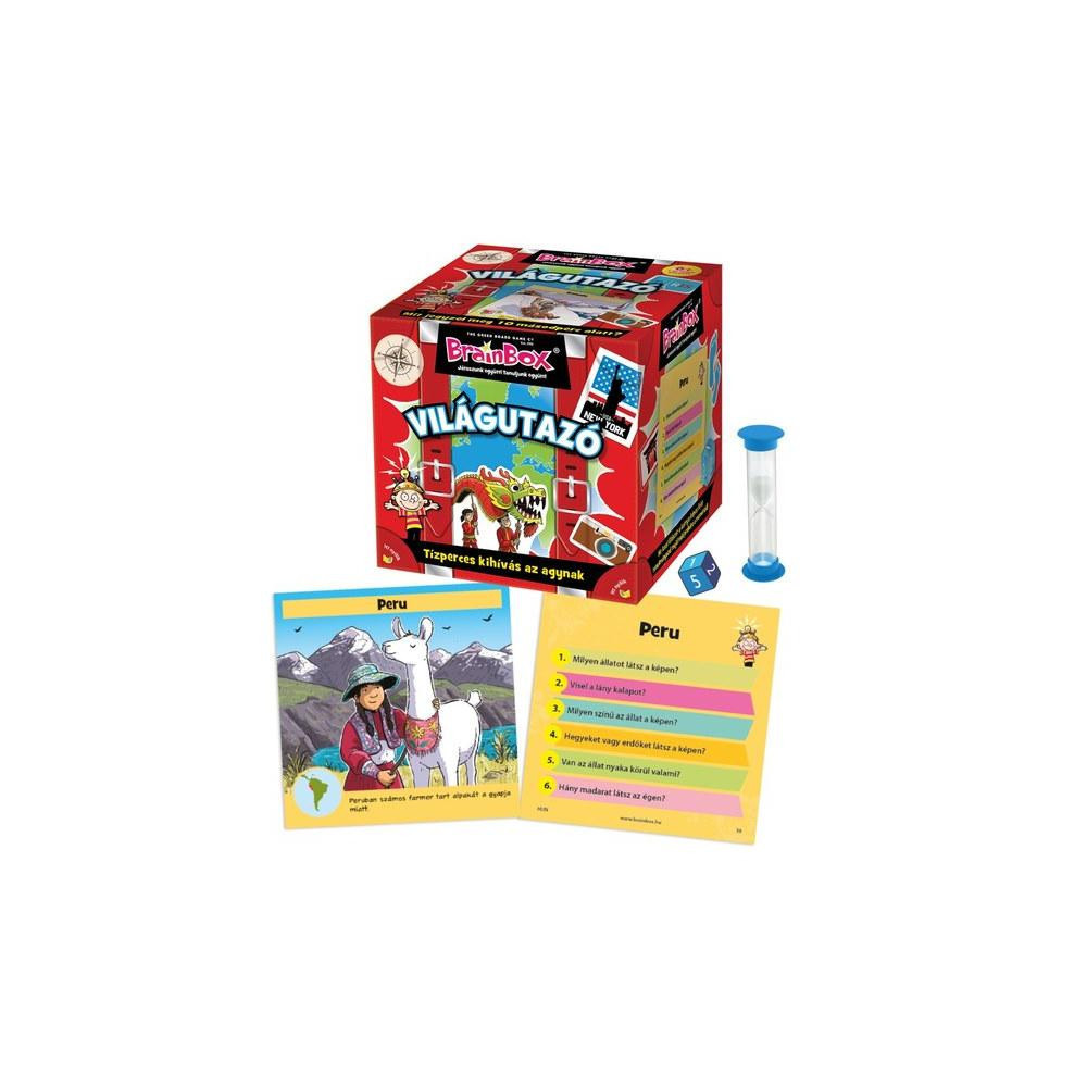 Itt az ideje, hogy okosabb legyél a felnőtteknél és bővítsd a tudásod! A Brainbox Világutazó társasjáték új világokat és országokat sorakoztat fel neked, amik csak arra várnak, hogy megismerd őket. Játékos tanulás, kreatív fejlődés egyszerűen! Játszunk együtt, tanulásra fel! Ha mindig érdekeltek a különböző kultúrák, országok és világok részletei, akkor a Brainbox Világutazó társasjáték tökéletes választás lesz számodra! A játék során körbejárhatjátok az egész Földet, felfedezhetitek egyes népek szokásait és különlegességeit, valamint különböző természeti csodákat is. A játék célja: Figyelj és jegyezz meg minél több információt 10 másodperc alatt az általad húzott helyszínnel kapcsolatosan. Ezután dobtok a kockával, és helyesen kell válaszolni a kérdésekre, az imént tanultak alapján. Ha helyesen válaszoltatok, megtarthatjátok a kártyát, a végén pedig a legnagyobb paklitulajdonos nyer! A játék 6 éves kortól ajánlott, kis csoportban érdemes játszani. A doboz tartalma: