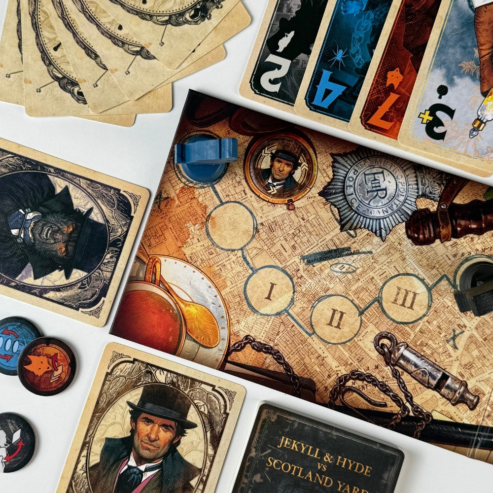 A Jekyll & Hyde vs. Scotland Yard egy kooperatív kártya alapú stratégiai játék, amelyben két játékos próbálja egyensúlyban tartani Jekyll kettős személyiségét, miközben a rendőrség a nyomukban van. Kihívást jelent a kártyák ügyes kijátszása, az egymás gondolatainak olvasása és a pszichológiai érzék elegáns alkalmazása.