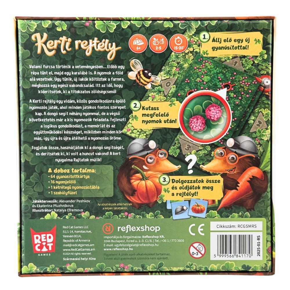 Egy vaksi vakondcsalád költözött a kert alá, és úgy tűnik, előszeretettel dézsmálják a terméseidet. Felbéreled a méhecske barátaidat, hogy kiderítsétek, melyik eltévedt földtúró a tettes. Dolgozzatok össze, zárjátok ki az ártatlanokat, és oldjatok meg minél több rejtélyt, mielőtt lejár az idő! Valami furcsa történik a veteményesben, és most a Kerti rejtély játék segítségével ki kell derítenetek, ki a titokzatos zöldségcsenő! Ez a nyomozós játék minden játékos számára fontos szerepet biztosít, fejleszti a logikus gondolkodást, a memóriát és az együttműködési képességet. Használjatok ki minden nyomot, és derítsétek ki, ki volt a huncut vakond! A játék folyamatosan új kihívásokat tartogat, és a siker attól függ, mennyire figyeltek egymásra és a részletekre. Egyszerre szórakoztató és gondolkodtató – gyerekek és felnőttek is élvezhetik a közös nyomozást. Tökéletes választás családi estékhez és vidám pillanatokhoz. A doboz tartalma:
