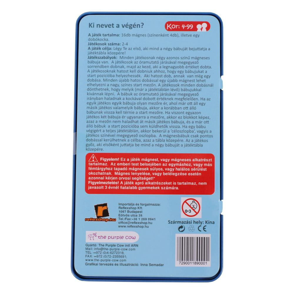 A Purple Cow Ki nevet a végén mágneses társasjáték a klasszikus társasjáték modern változata, amit kis méretének köszönhetően könnyen magaddal vihetsz. Régi klasszikus vadiúj köntösben! Próbáld ki a Purple Cow világhírű játékait, melyek ideálisak hosszabb utazásokhoz. A mágneses bábuk miatt nem kell aggódj az elvesztésük miatt. Élénk illusztrációk díszítik, melyek az ausztrál művész, Inna Semadar alkotásai. Gyűjtsd össze mindet a Purple Cow utazó társasjátékok közül!