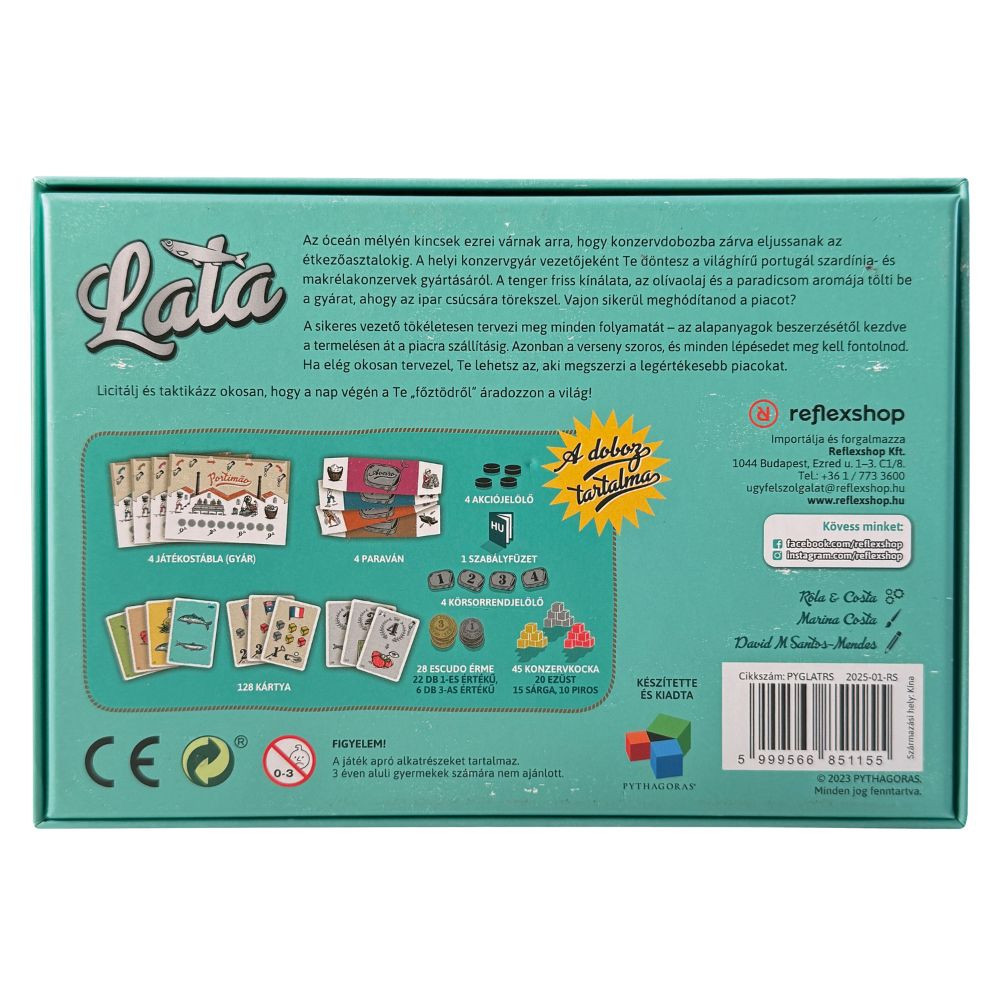 A Lata egy stratégiai gazdasági játék, amelyben a játékosok portugál konzervgyárakat irányítanak, és hat fordulón keresztül versenyeznek a piacok meghódításáért. Minden döntés számít: mit szerzel be, mit gyártasz le, és hogyan osztod be az erőforrásaidat. A játékmenet alapja a titkos licitrendszer, amely meghatározza a körsorrendet – a bátrabb ajánlatok nagyobb lehetőségeket, de kevesebb akciópontot hagynak a további lépésekhez. A fordulók során alapanyagokat szerzel be (szardíniát, makrélát, paradicsomot és olívaolajat), majd termelési és fejlesztési döntéseket hozol, hogy gyárad hatékonyabban működjön és a legjobb piacokra szállíthass.