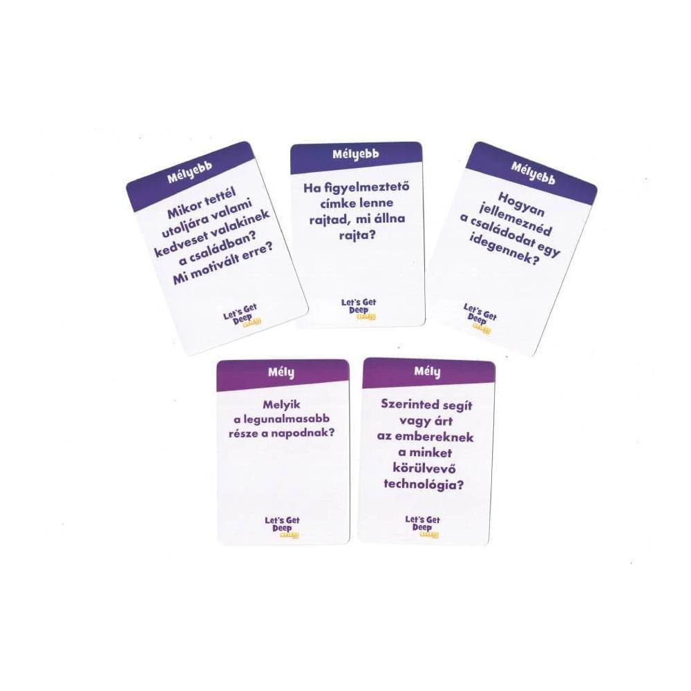 A Let's Get Deep – Családi kiadás társasjáték tökéletes lehetőséget kínál, hogy mélyebb beszélgetésekbe merülj családoddal vagy barátaiddal. Fedezzétek fel egymás gondolatait és érzéseit izgalmas kérdéseken keresztül, amik a kapcsolatok valódi mélységeit tárják fel. Ez a könnyed, mégis meghitt légkör lehetőséget ad a szórakozásra és az igazi, őszinte pillanatokra. Az egyszerű szabályok és jól átgondolt kérdések még élvezetesebbé teszik, hogy felfedezd, mi rejlik mások gondolataiban.