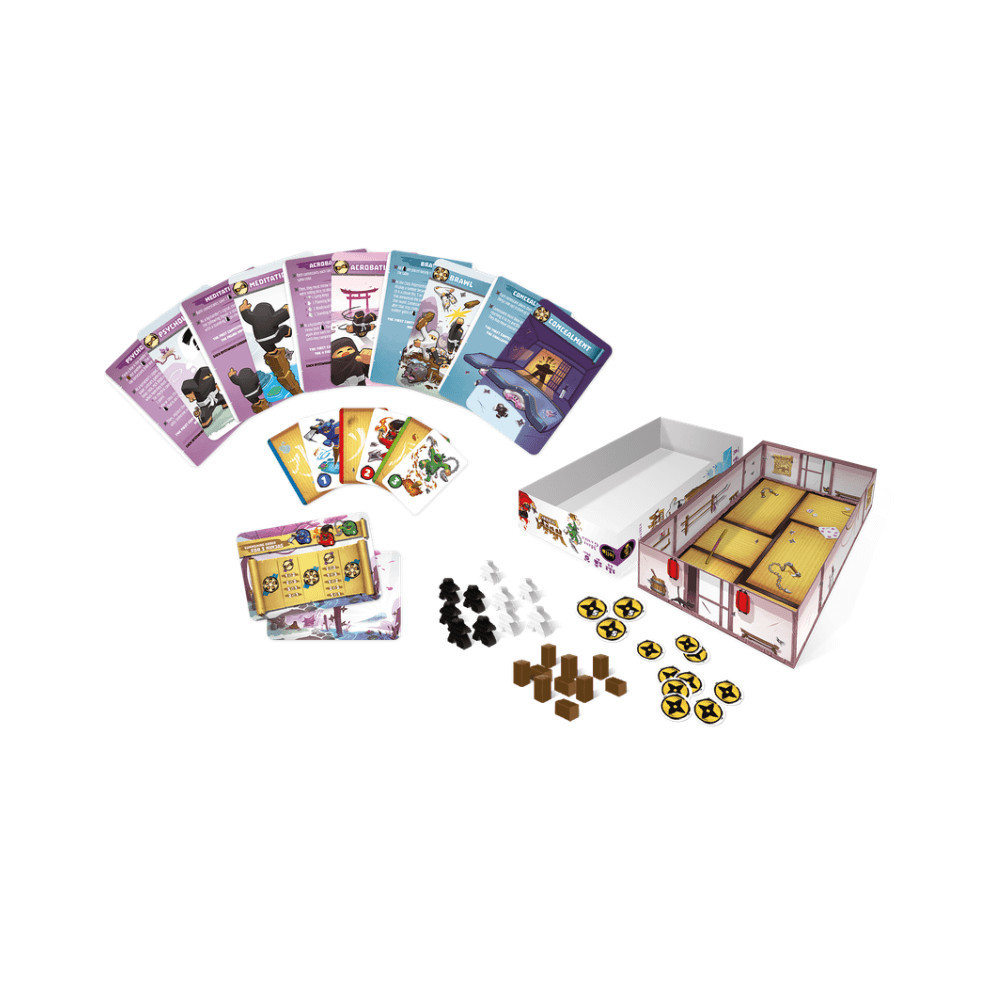 Számos véletlenszerű próbatételben kell helytállnod más tanoncokkal szemben, kihívásokkal teli edzésed során! Nem számít, hogy csapatosan vagy egyénileg versenyzel, a cél az, hogy te legyél a legjobb! Néhány példa a próbákból: egyensúlyozz mind az 5 ujjadon egy-egy ninja meeplet, találgass ellenfeleid mennyi ninja meeplet tettek a dobozba a csörgés alapján, legyél te a leggyorsabb, aki 5 farönköt egymásra állít! Gyűjts elegendő pontot és légy bölcs a fogadások során! A játék tartalma: