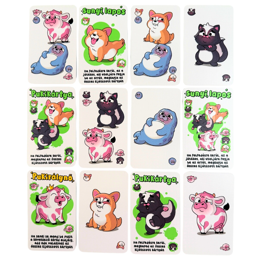 Szabadulj meg szélsebesen a lapjaidtól ebben a frenetikusan vicces kártyajátékban! Ereszd ki a gőzt, pontosabban a gázt, de mindig legyél alapos! Készülj fel a furfangra, gyanús csendekre, váratlan lebukásokra, és óriási nevetéscunamira! A játék titka, hogy légy óvatos, és ne bukj le! A Sunyi szelek ott kezdődik, ahol más társasjátékok befejeződnek: amikor valaki „gázos” helyzetbe kerül, és mindenki azt találgatja, ki volt az. Titokban engeditek ki a szelet, miközben próbáljátok úgy tenni, mintha semmi közötök nem lenne az egészhez. Gyanús csendek, eltitkolt röhögések, sandán félrenéző tekintetek – aztán valaki felkiált: „Puki!” A játék során állatkártyákat tesztek ki képpel lefelé, mindig úgy, hogy legalább egy állat egyezzen az előző kártyán lévővel. A pakli tele van pukikártyákkal és különleges képességekkel, melyek közül van, ami visszacsap, más mindent visz, és némelyiknél fontos, mikor feded fel. Bármikor bemondhatod a „puki” szót – ilyenkor kiderül, valóban ott lapult-e egy puki, vagy csak gyanúsnak tűnt valakinek. Aki rosszul tippel, kártyákat gyűjt, aki okosan játszik, megúszhatja a lebukást. A cél, hogy minél kevesebb kártya legyen a pukipaklidban a játék végére. Ez nem könnyű, amikor mindenki blöfföl, színészkedik, és próbálja kitalálni, ki a sunyi, ki csak megtéveszt. A Sunyi szelek könnyen tanulható, pörgős, és garantáltan nevetéscunamit hoz a családi vagy baráti estékbe. Keverjétek össze a paklit, engedjétek szabadjára a szelet, és derítsétek ki, ki tud a legügyesebben sunyiban maradni egy ilyen gázos társaságban!