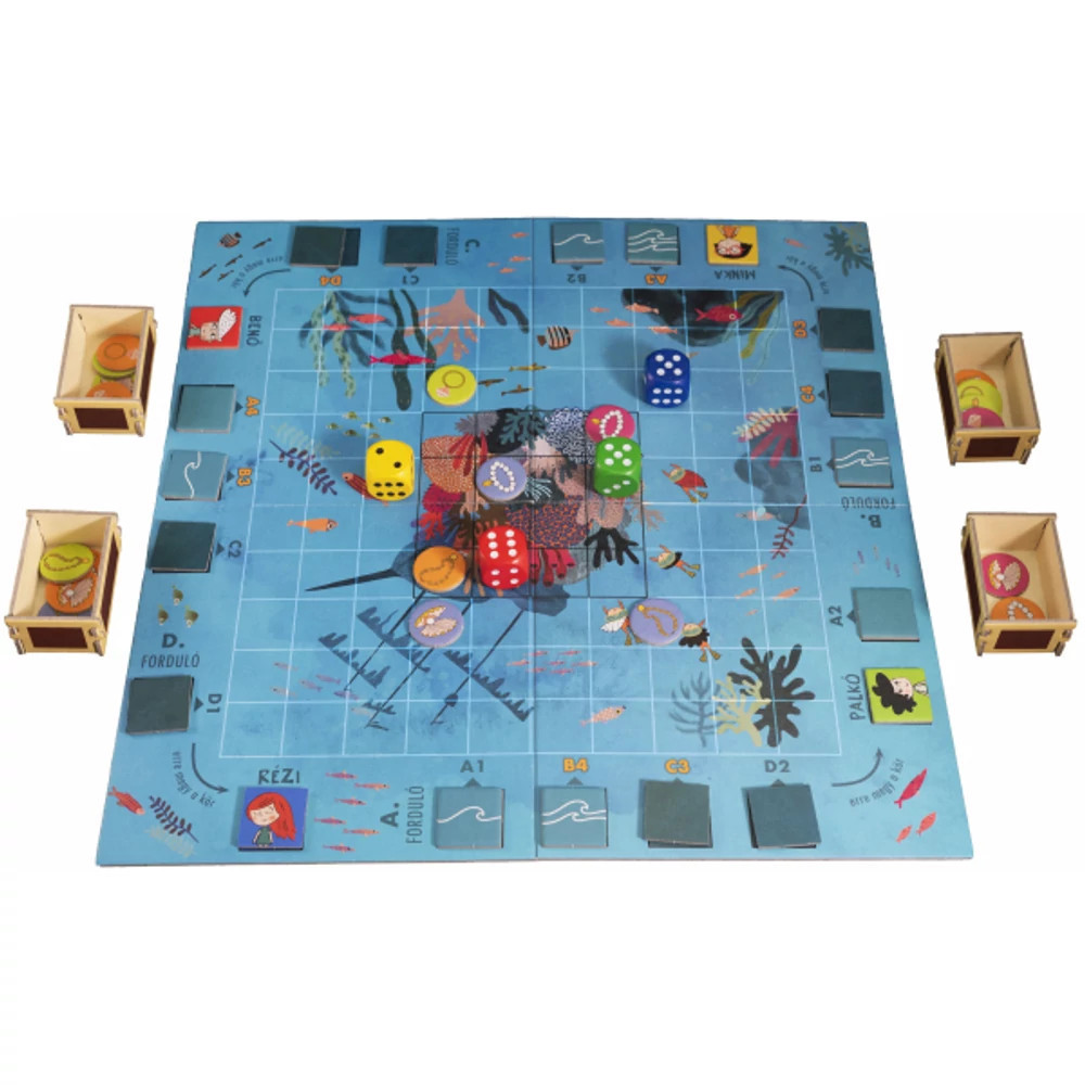 Kincsvadászatra fel! Négy barát - Rézi, Palkó, Minka és Benő - éppen a korallzátony közelében búvárkodik, amikor egy kalóz kincsesládája kinyílik a víz alatt, és a kincsek szétáradnak a tengeri áramlatokban. Segíts nekik kiszámítani, merre úsznak a kincsek, és kezdődjön a kincsvadászat! Ez a játék nemcsak szórakoztató, de fejleszti a térbeli tájékozódást és a logikai készséget is.