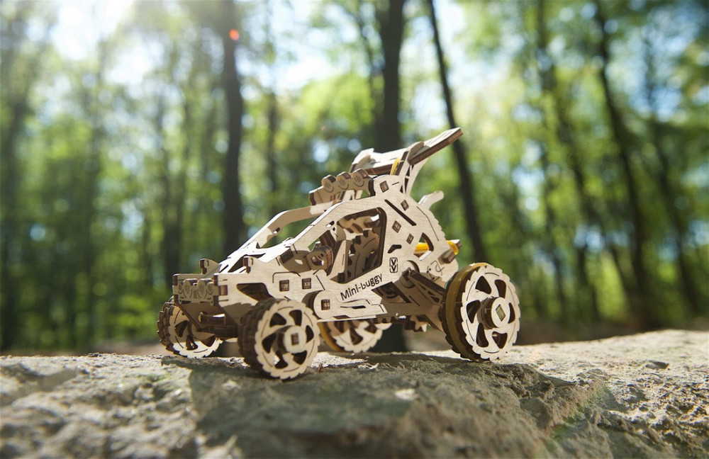 Üdvözöljük a járművek egyre bővülő flottájában az Ugears fából készült mechanikus modellek csodálatos gyűjteményében. Szeretnénk, ha megismernéd új kis kedvencünket: a gyors és szórakoztató Mini Buggy-t. Ez a miniatűr dűnebogárkocsi készen áll arra, hogy elvigyen egy körre.