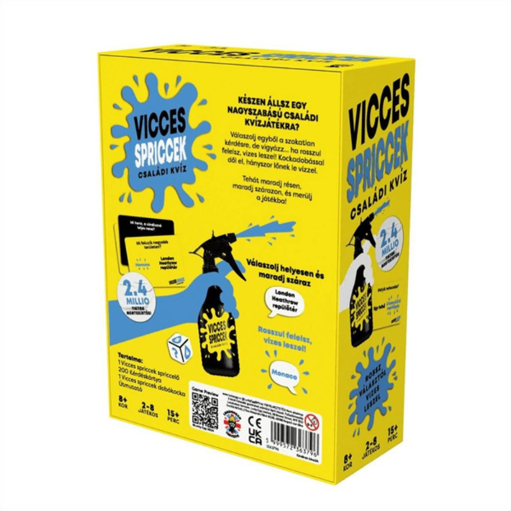 Vicces Spriccek nem egy átlagos kvízjáték – ez a tudás, a humor és a vízcsata tökéletes keveréke! Készülj fel egy fergeteges családi versenyre, ahol a hibás válaszok különleges következményeket hoznak: egy hideg spriccelés az arcodba! A nevetés már az első pillanatban garantált, miközben mindenki izgatottan várja az újabb vizes meglepetéseket. Ez a játék próbára teszi tudásodat, reakcióidődet és hidegvéredet – hiszen a jó válasz és a száraz ruha között néha csak egy pillanat van.