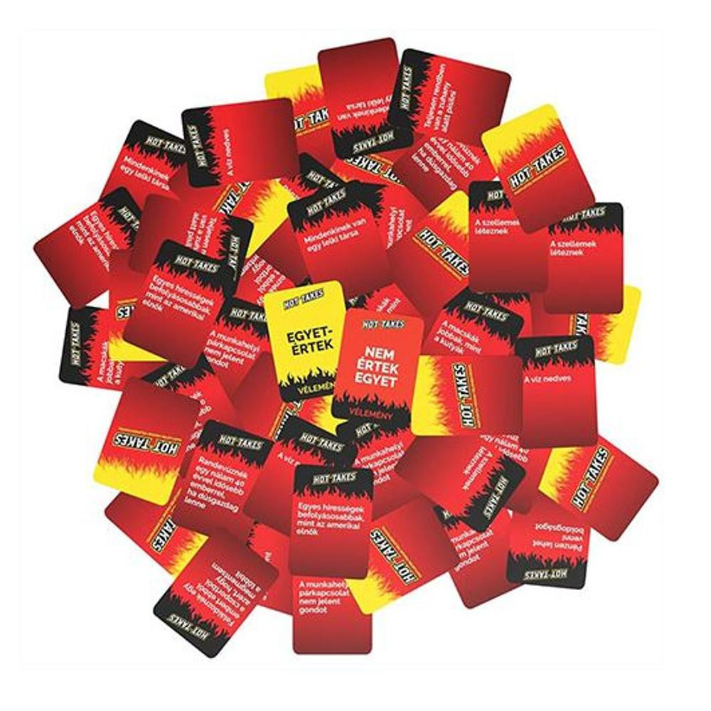 Úgy gondolod, hogy a legtöbb kérdésben azonos a véleményetek a barátaiddal? Az alapvető dolgokban lehet, hogy így is van, de vajon beszélgettetek már olyan témákról, mint: "A hotdog szendvicsnek számít-e, vagy sem?", vagy "Mindig kell-e egy dominánsabb fél egy kapcsolatban?" Derítsd ki a Hot Takes játékkal! Ez a remek party játék tele van érdekes kérdésekkel, amelyek segítségével rengeteg mindent megtudhattok egymásról. A játék során minden körben egy kérdés kerül terítékre, amire minden játékos őszintén válaszol. Az igazán pikáns véleményekkel garantáltan beindul a beszélgetés.