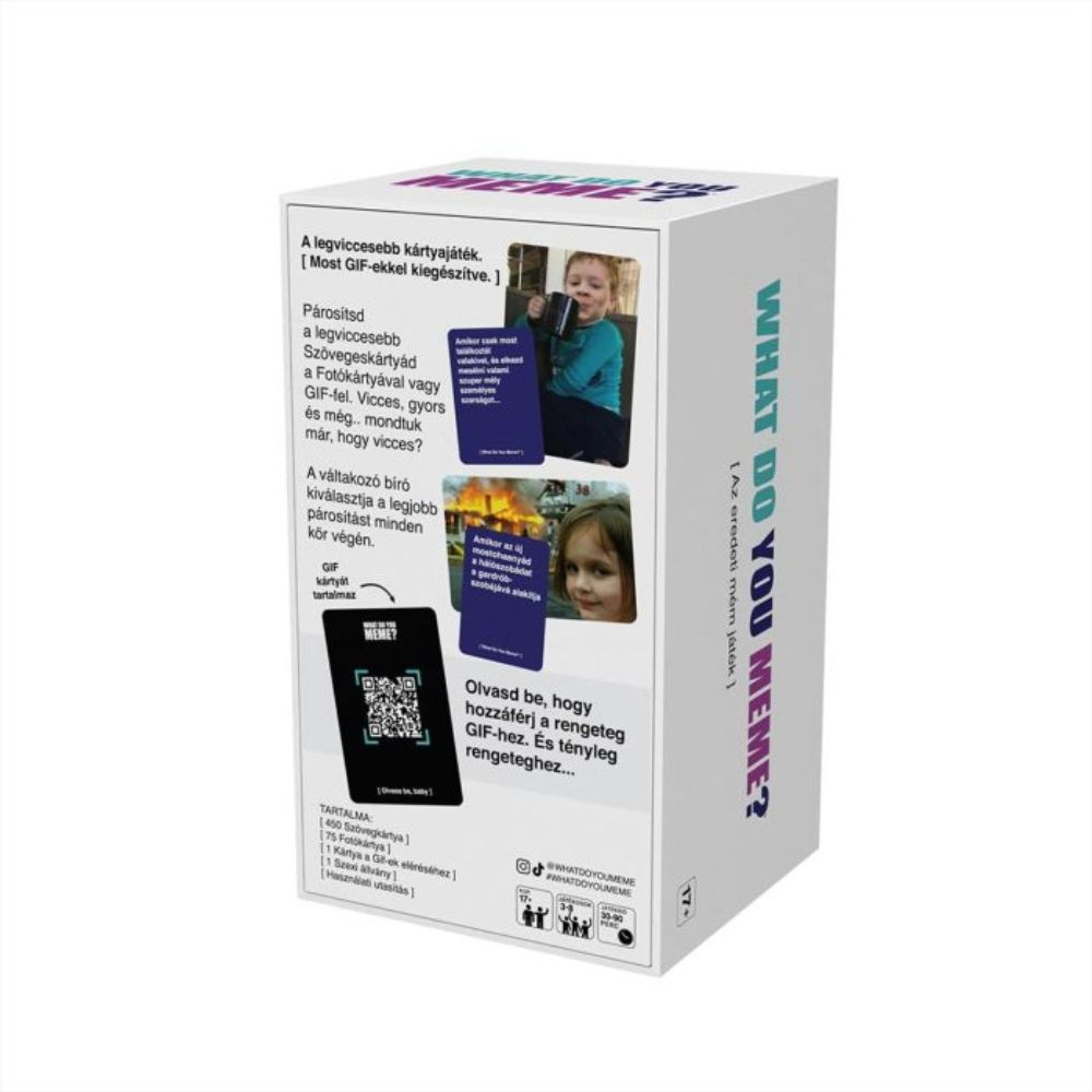 A legnépszerűbb mémjáték most életre kel – mozgásban! A What Do You Meme – GIF Edition új szintre emeli a nevetést: a klasszikus képek helyett most híres és vicces GIF-ekhez kell a legjobb feliratokat párosítanod. Egyszerre kreatív és totál abszurd, tele ikonikus pillanatokkal az internetről. Tökéletes választás baráti bulikra, céges estekre vagy bármilyen alkalomra, ahol a cél a szórakozás és a hangos nevetés.