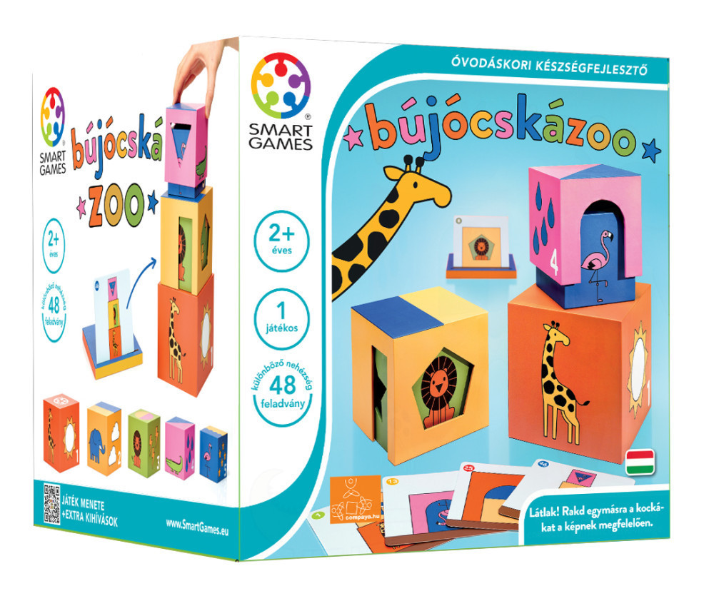 Az állatkerti állatok imádják a bújócskát, és ebben a játékban neked kell kiderítened, merre rejtekeznek az aranyos kis állatkák! Oldd meg a kártyákon lévő rejtvényeket, és annak alapján helyezd egymásra a különböző színű kockákat! A BújócskáZoo egy remek készségfejlesztő játék óvodás korú gyermekek számára. A kockákkal való játék nemcsak a térbeli tájékozódást fejleszti, hanem segít megismerni az állatokat és az olyan alapfogalmakat, mint a: fent, lent, belül és kívül.