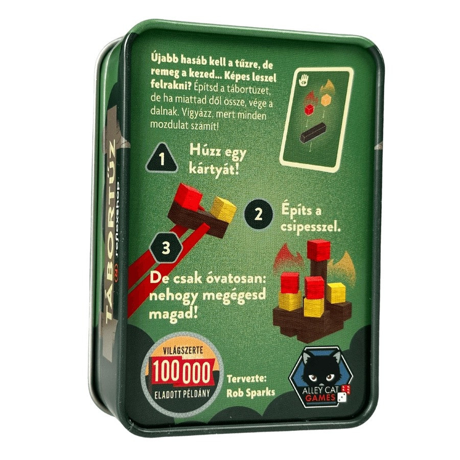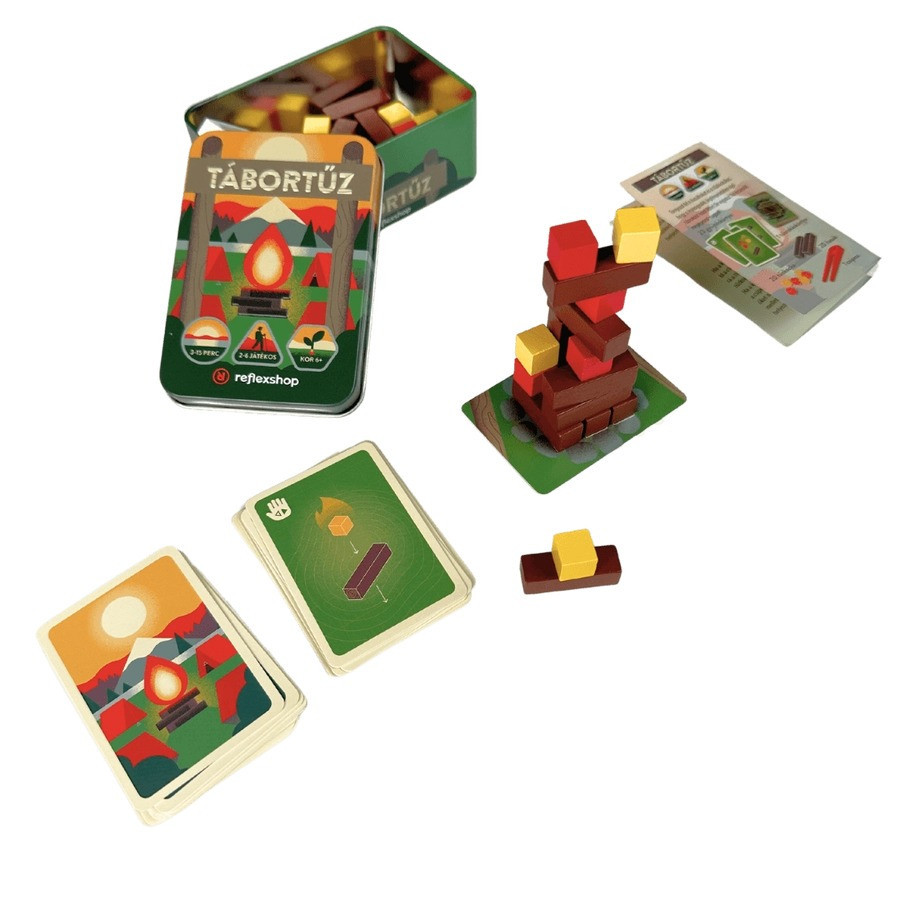 A kirándulás és kempingezés során a legjobb élmények közé tartozik, amikor végre sikerül meggyújtani a tábortüzet, de előtte azt meg is kell építeni. Ebben a pörgős, addiktív és kihívásokkal teli Tábortűz társasjátékban nemcsak a szerencsére, hanem az egyensúlyérzékedre is szükséged lesz. Egy csipesz segítségével hasábokat kell raknod, hogy a legnagyobb és legfényesebb tűzrakást hozd létre - vigyázva, hogy semmi ne dőljön le.