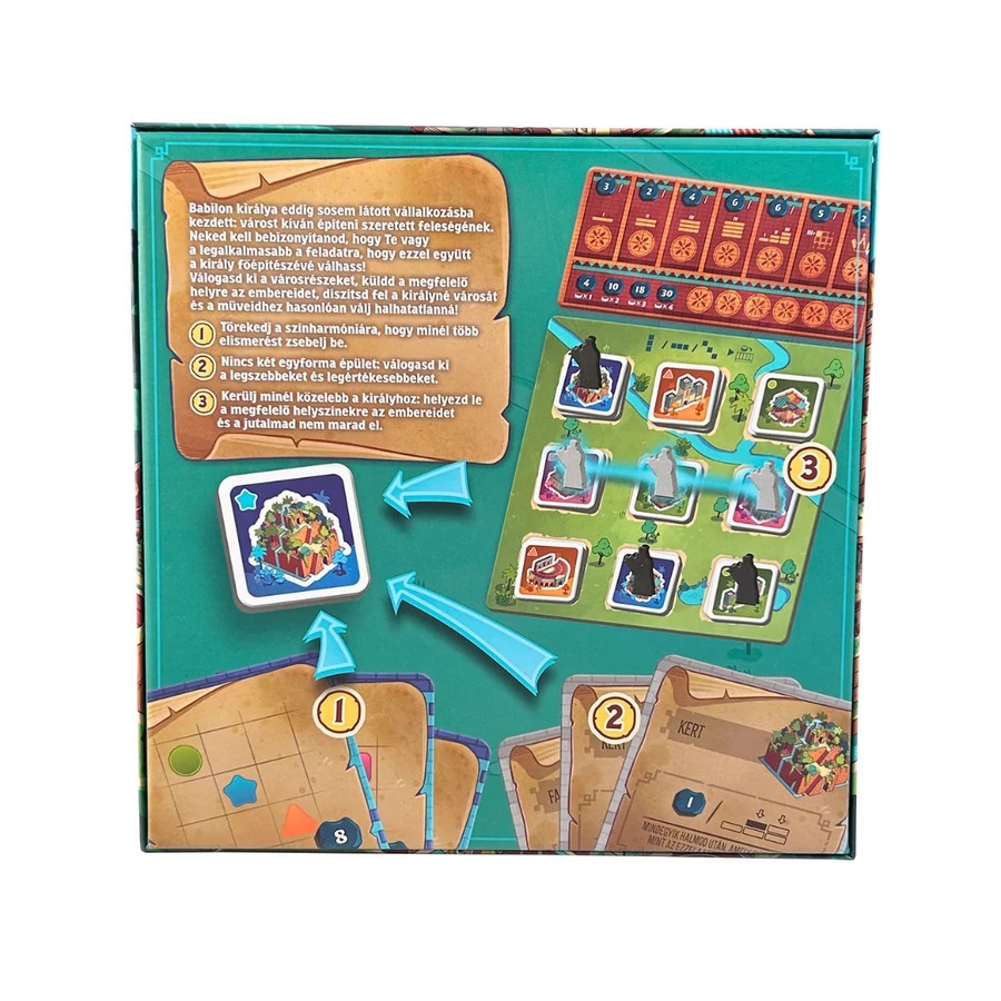 Babilon tornyaiban a világhírű ősi csodát, a Függőkerteket kell újraépítened lapkák segítségével. A játékban munkásaidat elhelyezve optimalizálhatod az erőforrásaid kihasználását, és minél több pontot szerezhetsz. Terved, hogy a legtöbb ponttal zárd a játékot, így elnyerve a király kegyét és a királyi főépítész címet. Húzz csodákat, gondolkodj stratégiában, és építsd meg a legszebb várost Amütisz királynő számára. Körödben az egyik építészedet egy elérhető halomra helyezed, majd a megszerzett épülettel bővíted a városodat, amelyért pontokat kapsz. Az épületek színe lehetővé teheti a tervrajzok lezárását, amely további presztízspontokat jelenthet. Törekedj színharmóniára, hiszen ez növeli az elismerésed. Nincs két ugyanolyan épület, tehát gondosan válogasd ki a legszebbeket és a legértékesebbeket. Minél közelebb kerülsz a királyhoz, annál nagyobb lesz a jutalmad. A játék végét a második épülethalom elfogyása jelzi, ezután összegezzétek a pontokat: játékmenet közbeni, tervrajzokért és a megszerzett kegyekért kapott pontszámot. A legtöbb pontot gyűjtő játékos nyer és válik a királyi főépítésszé. A Babilon tornyai ötvözi a lapka- és munkáslehelyezős mechanikát egy lenyűgöző grafikával rendelkező társasjátékban. Játékosok száma: 2 fő. Játékidő: 30 perc. Ajánlott kor: 10 év felett.