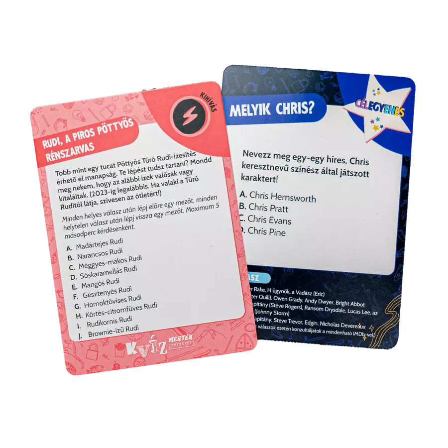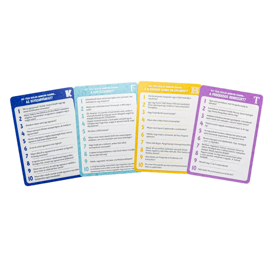 Mérd fel tudásod egy 10-es skálán a Kvízmértékben! Alakítsatok maximum 4 fős csapatokat, válasszatok nehézségi szintet, és harcoljatok a tudásért különböző kategóriákban! Vajon ki a legnagyobb Jóbarátok rajongó, vagy a biológia szakértője? Merd bevállalni a 10-es szintet a legtöbb pontért, de vigyázz, a hiúság veszélyes lehet! A játékfilm, zene, sport, tudomány, természet és történelem témakörökben kínál izgalmakat. Csapatként versenyezzetek, válaszoljatok helyesen a kérdésekre, és legyetek ti a győztesek az utolsó mezőn! Doboz tartalma: