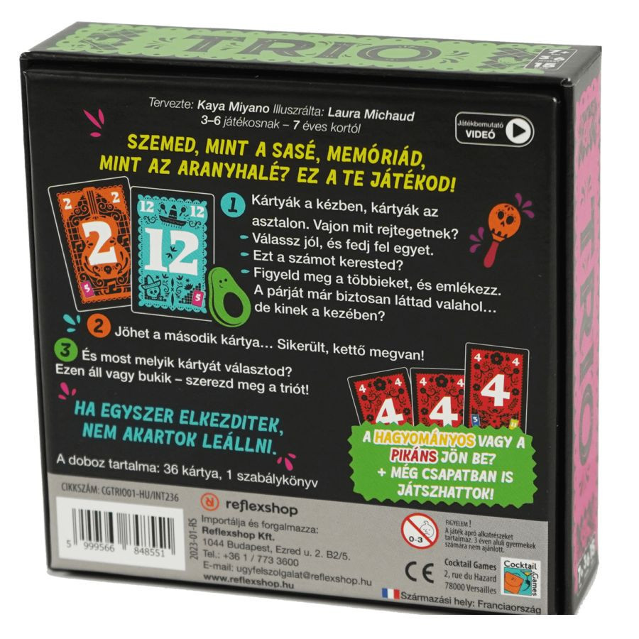 Egy tenyérnyi kártyajáték, amely roppant egyszerű, mégis hatalmas szórakozást biztosít az egész családnak és baráti körnek. Cél, hogy a többieknél gyorsabban gyűjts össze egy triót, vagyis három ugyanolyan kártyát. Hagyományos módban bármelyik trióval vagy a 7-es trióval nyerhetsz. A pikáns mód pedig kihívásokkal teli, ahol két kapcsolt triót kell összegyűjteni. A játék az As d'Or 2024 - Az év játéka díjat is elnyerte! Neked mennyire jó a memóriád? Mennyire jól kérdezel? A kör az óramutató járásával megegyező irányba halad, és a saját körödben kártyákat kell felfedned.