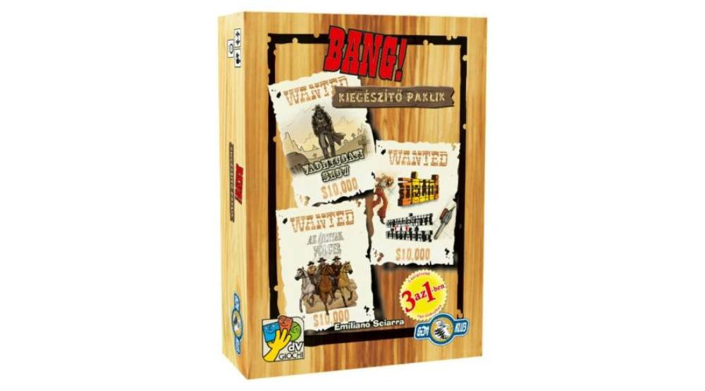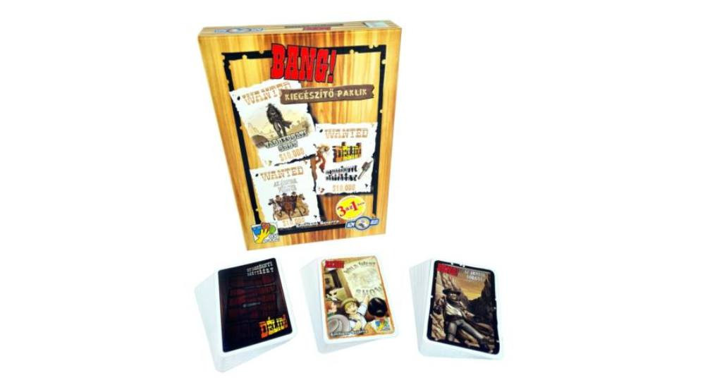 A Bang! kiegészítő paklik négy kihagyhatatlan kiegészítőt tartalmaznak egy dobozban, hogy még izgalmasabbá tegyék az eredeti Bang! társasjátékot. Az Árnyak völgye kiegészítőben a bátrak merészkedhetnek be az anomáliákkal teli árnyak völgyébe, ahol nem csak a csörgőkígyók és tornádók veszélyesek, hanem még az ellenségeid szellemei is ott kísértenek. A Vadnyugati showban pedig még több erős revolverhős és izgalmas párbajok várják a játékosokat.