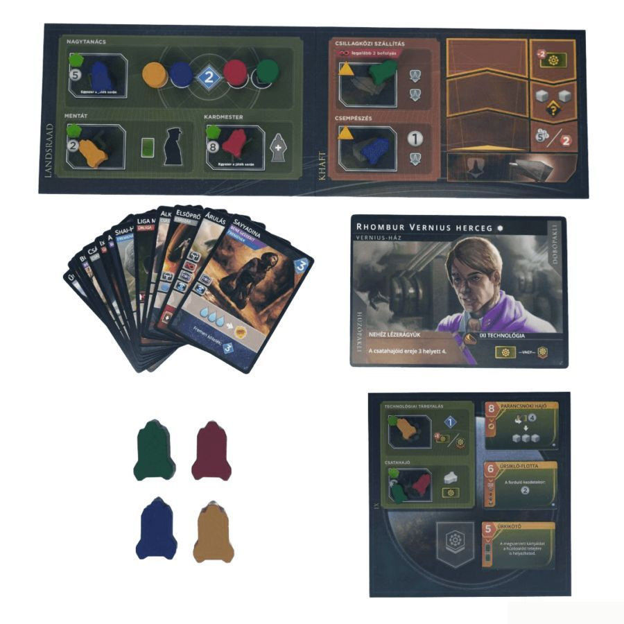 1 KHAFT tábla, 4 ütközetkártya, 17 intrikakártya, 18 techlapka Ix tábla, 4 besúgójelölő, 35 impériumkártya, 6 vezetőkártya. Egy- vagy kétszemélyes játék esetén használatos elemek: 9 Hagal-ház kártya, 2 rivális segédletkártya, 1 korong, 2 csatahajó, 1 kezdőkártya. Játékosok száma: 1-4 fő, ajánlott életkor: 13+ év.