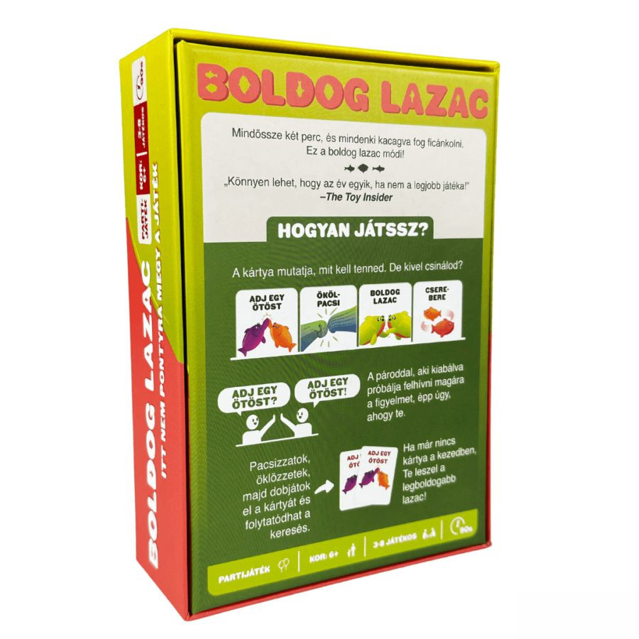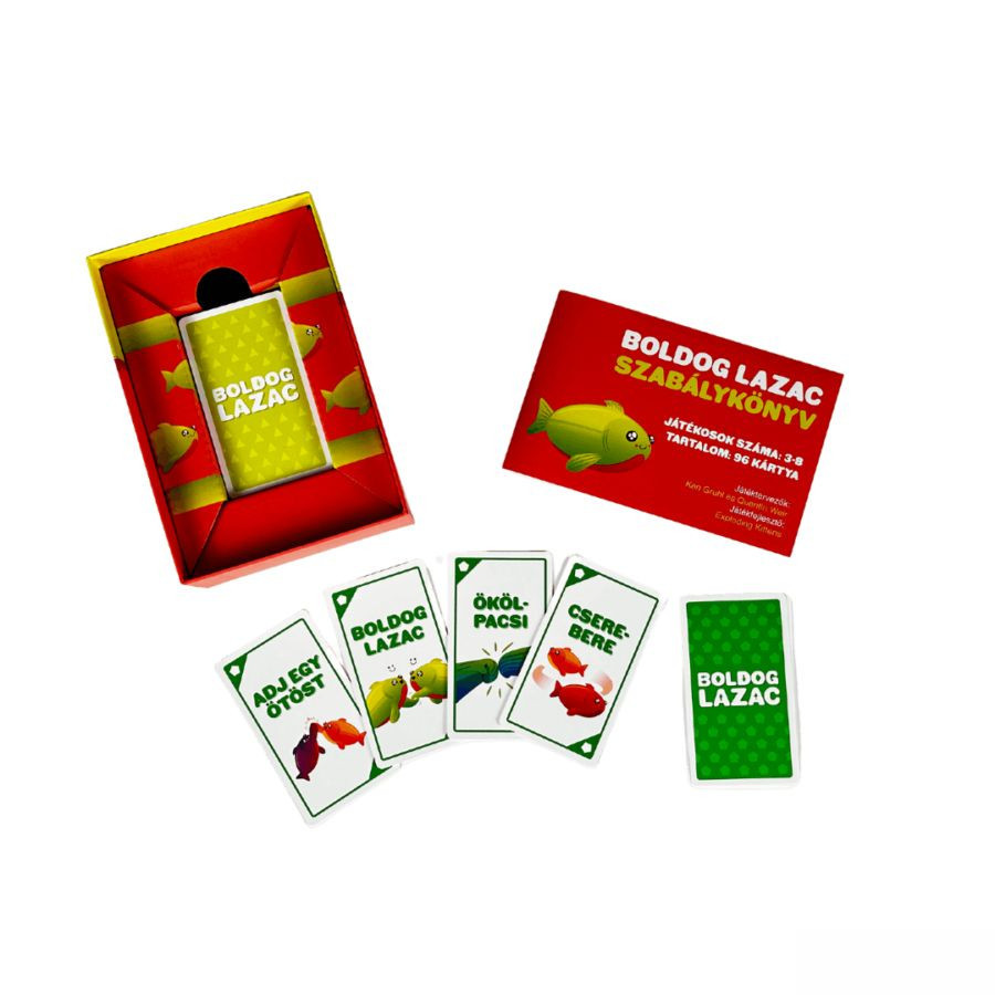 Szabadulj meg a kártyáidtól minél gyorsabban és hajts végre egy utasítást egy másik játékossal - egyszerű, ugye? Pacsizzatok, cseréljetek helyet vagy játsszátok el, hogy ti vagytok a ficánkoló lazacok! A Boldog Lazac megújult formában is ugyanaz a könnyed partijáték, amit kicsik és nagyok egyaránt élveznek. Egy őrült, pörgős szórakozás az egész család számára! Könnyen tanulható és játszható. Olvassátok fel egyszerre a kártyáitokat, ha két embernek megegyezik a kártyája, végrehajtják a feladatot, majd eldobják azt. Ezt folytatják tovább, amíg valakinek el nem fogy az összes lapja és megnyeri a játékot. Vajon a te kezedből fogy el leggyorsabban? A játék tartalma: