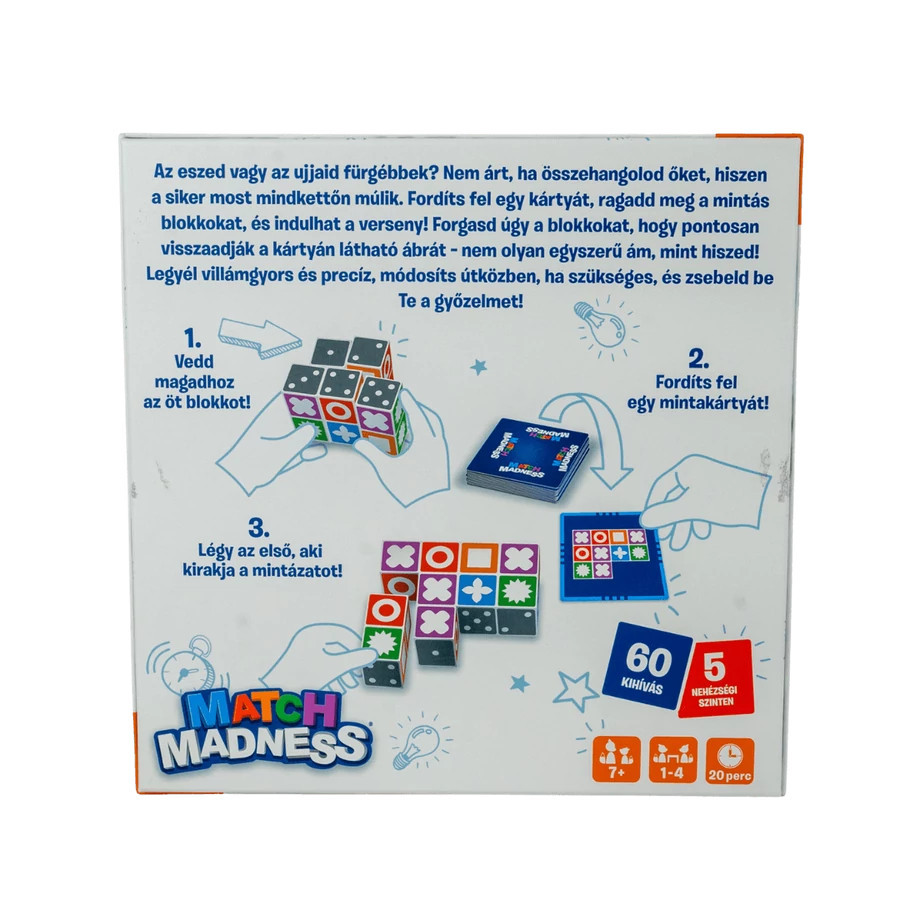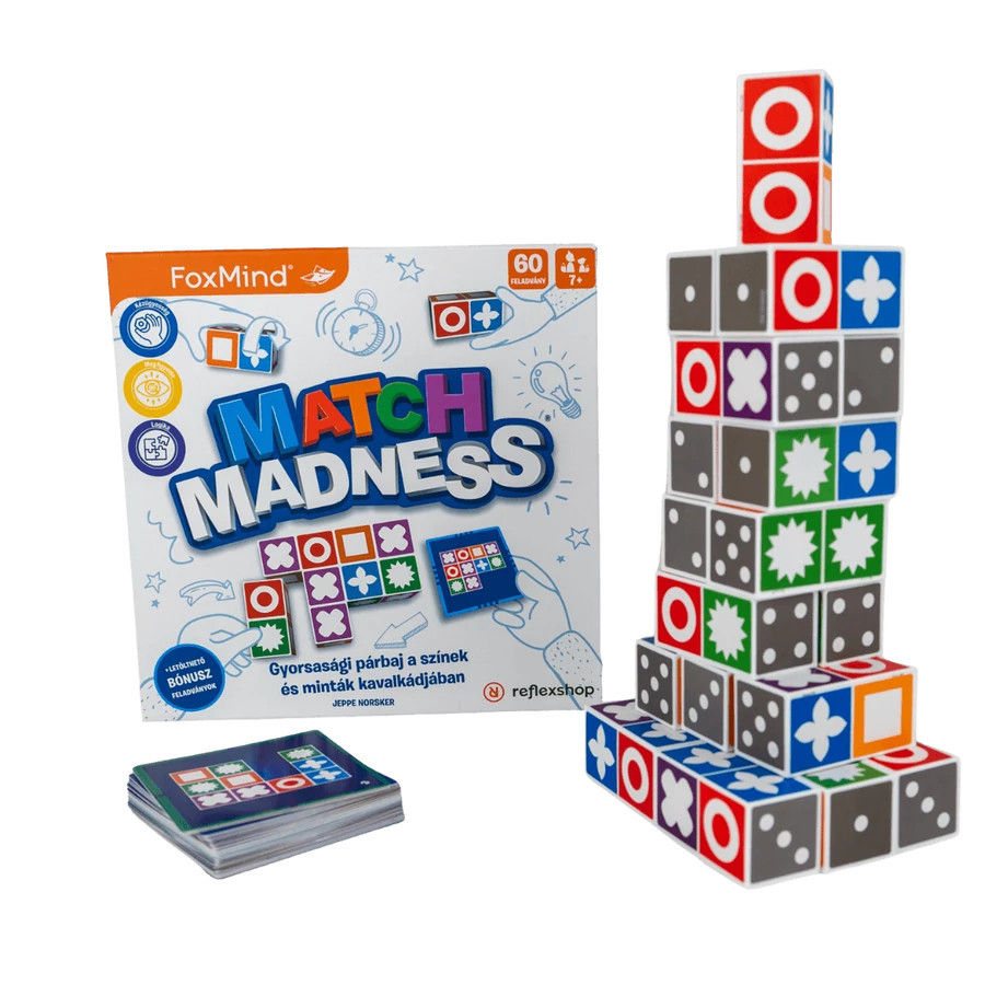 A Match Madness társasjáték igazi kihívást jelent minden korosztály számára! A játékot akár 2-6 játékos is játszhatja, így egész család vagy baráti társaság részvételével is remek szórakozást nyújt. Az ajánlott korosztály 8 évtől kezdődik, de az idősebb játékosoknak is szórakoztató kihívás lehet.