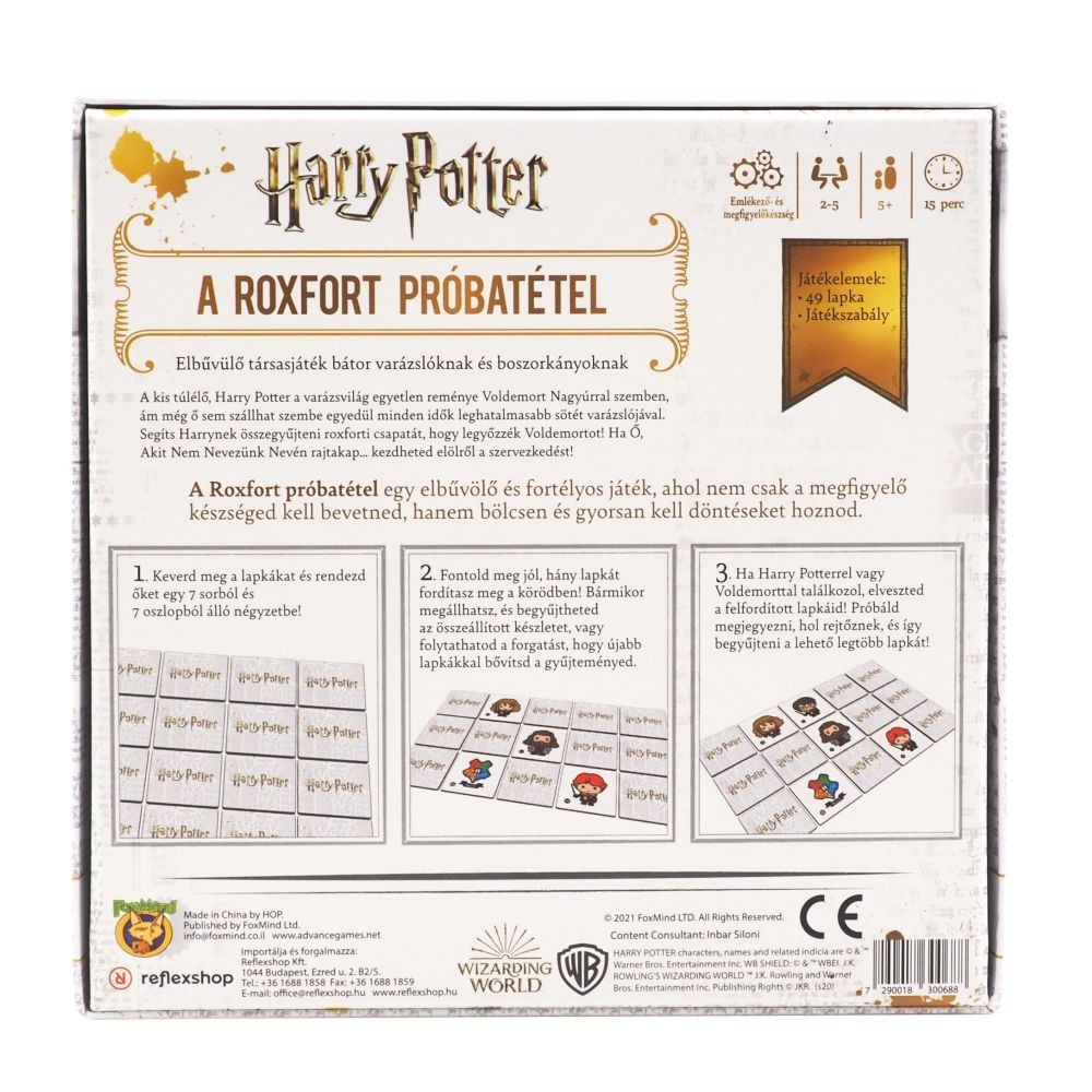 A Roxfort próbatétel egy fordulatos és gyors memóriajáték, amelyet Reiner Knizia tervezett kifejezetten fiatalabb gyerekeknek. Ebben a játékban a játékosok célja, hogy segítőket gyűjtsenek össze Harry Potter oldalán a varázslatos világban, miközben elkerülik Voldemort Nagyúr csapdáit. A játék során a lapkákat 7x7-es elrendezésben helyezik el képpel lefelé, és a játékosok a körükben fordíthatják fel őket. A cél, hogy összegyűjtsék Hermione, Ron, Hagrid, McGalagony és Dumbledore lapkáit a szabályok szerint, miközben Harry csak akkor gyűjthető be, ha a kör alatt nem fordítanak fel másik szereplőt. Voldemort, mint akadály, azonnal véget vet a körnek, ha valaki megtalálja. A játék nyertese az lesz, aki a legtöbb lapkát gyűjti, kiegyenlített állás esetén pedig az, aki több Harry lapkát szerzett. Ideális választás mind a kisebbek, mind a Harry Potter rajongók számára a varázslatos illusztrációk és a jól ismert téma miatt.