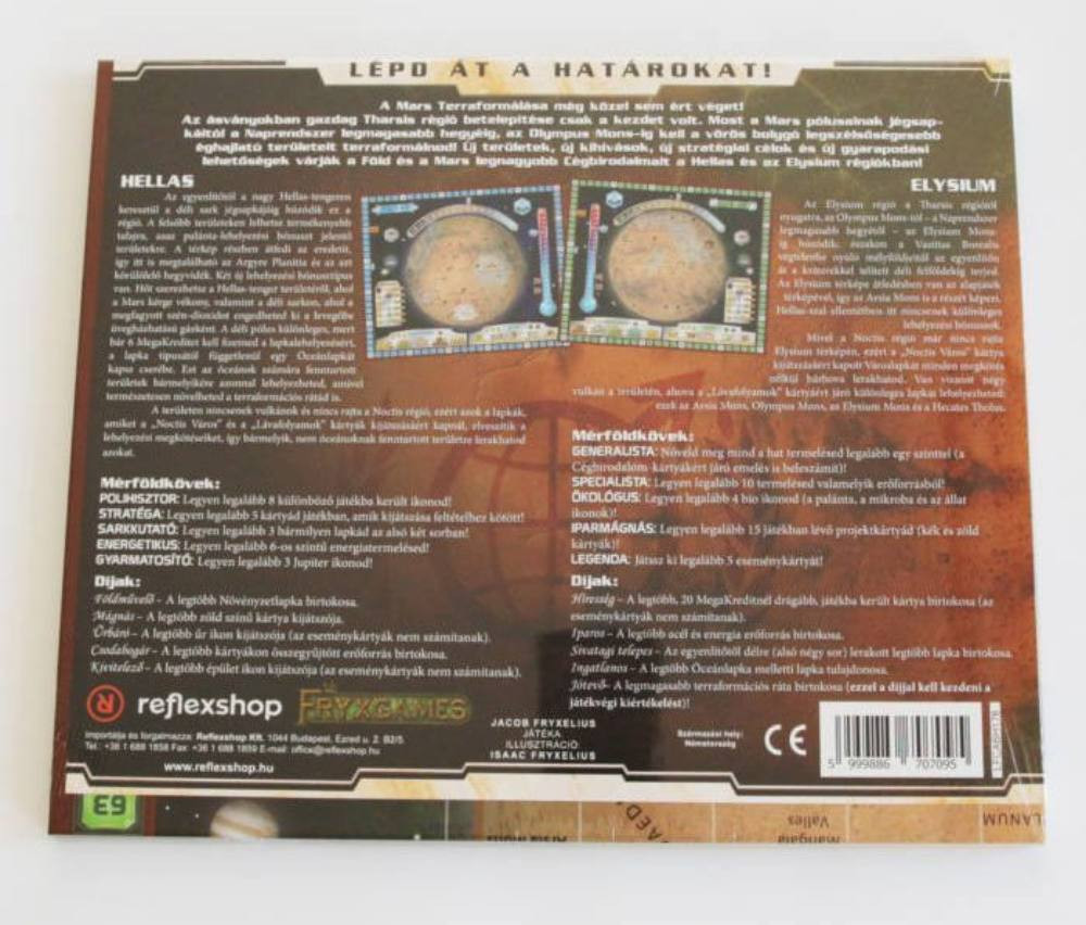 A Mars terraformálása játék első kiegészítője a Hellas & Elysium, amely új, kétoldalas játéktáblát kínál, bemutatva a Mars eddig ismeretlen területeit. Az új mérföldkövek és díjak tovább növelik a játék újrajátszhatóságát és változatosságát. Fedezd fel a Mars másik oldalát! A Hellas déli sarkának zord vidékét és a gigantikus, 7 hexagos Hellas krátert tartalmazza, ahol hő formájában jelenik meg építési bónusz. Az Elysium térképen a Naprendszer legmagasabb hegyével, az Olympus Monsszal találkozhatsz, melynek megszerzése 3 ingyenes kártyát jelent. Mindkét térkép egyedi mérföldköveket és díjakat tartalmaz, mint például a „SARKKUTATÓ” mérföldkövet, melyet akkor szerzel meg, ha három lapkát helyezel el a déli sark körül. Fontos, hogy a játék önmagában nem játszható, csak a Mars terraformálása alapjátékkal együtt! Játékosszám: 1-5 fő, játékidő: 90-120 perc, korosztály: 12+ év.