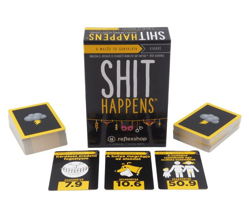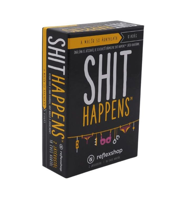 A Shit Happens - A malőr 50 árnyalata partijáték egy igazán szórakoztató társasjáték, amelyet 2-8 játékos játszhatnak egyszerre. Az ajánlott életkor 18 év felett van, hiszen a játékban olyan hétköznapi problémákkal találkozunk, amelyeknek lehet, hogy nem mindenki a célközönsége. Azonban, ha szereted a fekete humorú játékokat, akkor ezt a játékot imádni fogod!