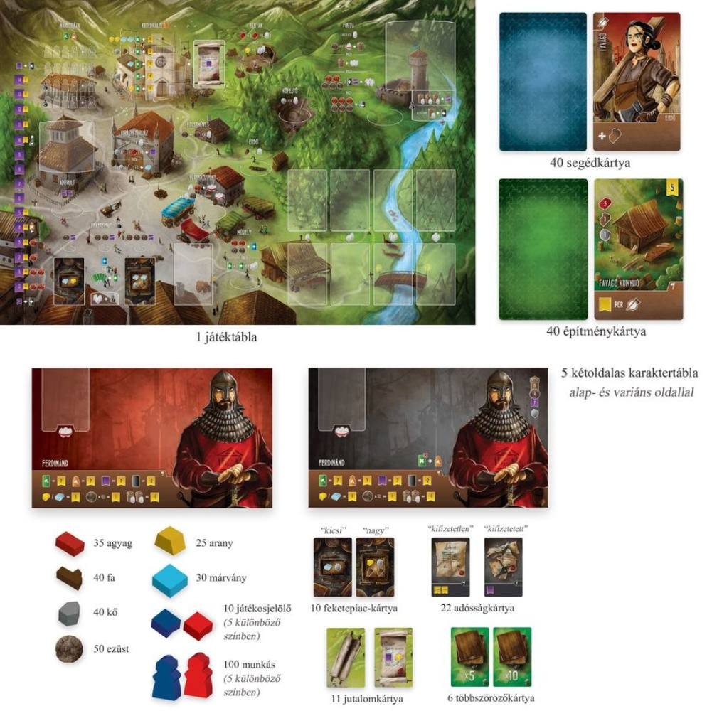Nem volt könnyű az építészek dolga a IX. századi Frank Birodalomban sem. Csak azoknak van esélyük lenyűgözni a királyt, akik ügyesen egyensúlyoznak az olcsóbb építéshez olykor szükséges "fű alatti" beszerzések és a becsületesen kitermelt nyersanyagok használata között. Tedd magad próbára A nyugati királyság építőmesterei társasjátékban! Ez a játék 1-5 játékos számára készült, és 60-80 perces játékidőt biztosít, 12 éven felüli játékosoknak. Az építkezés megkezdésének időzítése kulcsfontosságú, mivel a játékosok nem gyűjtik vissza automatikusan munkásaikat a fordulók végén. Az erényszint szinte minden döntésedet befolyásolja; a magasabb szinten járó előnyök mellett bizonyos korlátozásokat is tapasztalhatsz. A játék során a következő játékelemekkel találkozol: