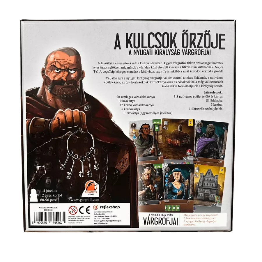 A Nyugati királyság várgrófjai: A kulcsok őrzője kiegészítő tovább növeli a feszültséget a királyi udvarban. Akik úgy döntenek, hogy titkos szövetségeket kötnek, vagy a várfalak közé rejtett kincsek után kutatnak, most itt az idő, hogy kihasználják a helyzetet. A kiegészítő új kihívásokat kínál, ahogy a királyi hatalom gyengülése közepette a Várgrófok megpróbálják megszilárdítani befolyásukat. Vajon ki emelkedik ki győztesként a királyság rejtett birodalmában? Készen állsz az új lehetőségekre? Az új tartozékok között találsz hőskártyákat, városlakókártyákat, kéziratokat, valamint nyilvános épületeket, melyek mind újraírják a stratégiai határokat. A játék végén extra pontokat kapsz az elért nyilvános épületek és begyűjtött ládalapkák alapján. Akár a végsőkig hűséges maradsz, akár a saját kezedbe veszed a döntést, most rajtad múlik, hogy kihasználod-e az új lehetőségeket a királyságban. Doboz tartalma: