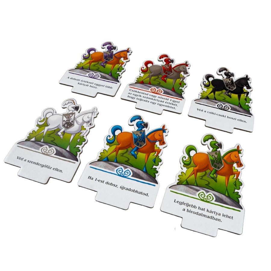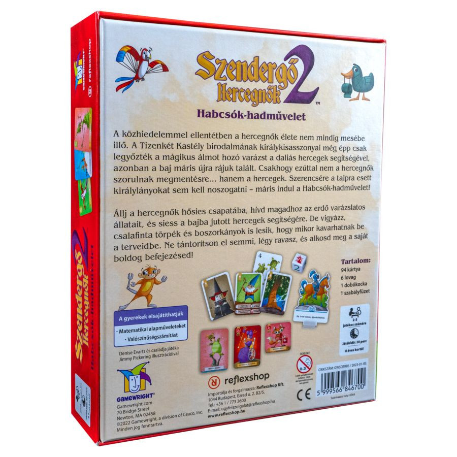 A nagy mesékből is megtanulhatjuk, hogy a hercegnők élete nem pusztán játék és mese. Kalandra fel a Habcsók-hadművelettel! Hívd magadhoz a varázslatos erdő állatait, kerüld el a boszorkányokat és csalafinta törpéket, sietve segítsd a bajba jutott hercegeket. Vezessétek haza a hercegnőket, akik úton vannak vissza a kastélyaikba. De szükség van a segítségedre, hogy megmentsd a veszélybe került hercegeket. Készen állsz megmenteni a balszerencsés hercegeket? Akció indul! Játékmenet során 2 játékos esetén összesen 4 herceget, 3-4 játékosnál 3 herceget, míg 5 játékosnál 2 herceget kell megmenteni a győzelemhez. A játékhoz való felkészülés során a kártyák hátlapjuk alapján különválasztásra kerülnek: főpakli, hercegek és mentőtársak. Keverjük meg a paklit és alkossunk húzópaklit a mentőtársakból. A saját körödben dobj a különleges dobókockával és hajtsd végre az akciókat, hogy bővíteni tudd a birodalmadat és megmentsd a hercegeket. A hercegeket hercegnőkkel és hozzátartozó mentőtársaikkal mentheted meg, amelyek a dobópakliban találhatók. Tedd próbára magad ebben a kalandos és izgalmas játékban, mely Miranda Evans hatévesen alkotta, és élvezd Jimmy Pickering elbűvölő illusztrációit! Tartalom: 40 számkártya (1-10-ig, mindegyikből 4 db), 12 hercegnő, 10 herceg, 2 segédlet, 6 varázstörpe, 5 csiki-csuki-boszi, 5 szendergőfűz, 4 bűbájkönyv, 10 mentőtárs, 6 lovag talppal és 1 egyedi dobókocka. Kösd fel a szoknyát, mentsd meg a hercegeket!