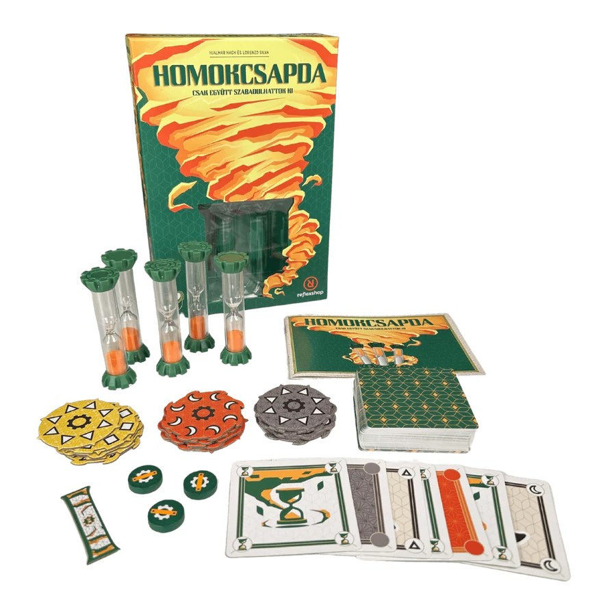 Merülj el egy valós idejű kooperatív társasjáték világában, ahol az ügyességed és a gyorsaságod próbára tétetik! A Homokcsapda társasjáték több mint 20 izgalmas fordulatot vár rád a fogaskerekek és a folyó homok útvesztőjében. Ne engedd, hogy az értékes idő elfusson, és oldd meg a feladványokat a lehető leggyorsabban! De vigyázz, a kapkodás könnyen bajba sodorhat. Csak együtt szabadulhattok ki! Dolgozzatok össze, hogy megfékezzétek a homokcsapdát, ezt a régi masinát. Csapatmunkával észben tartva megfékezhetitek az ősrégi szerkezetet. Kártyákat játszotok ki, hogy megfordítsatok homokórákat és tovább lépjetek. Célotok, hogy egyik homokóra se peregjen le idő előtt. Te mennyire gondolkodsz gyorsan? Próbáld ki magad most!