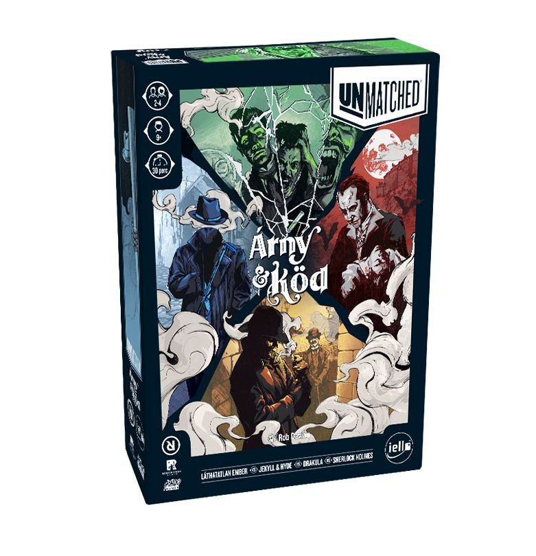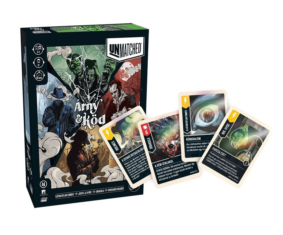 Ismerd meg a Unmatched sorozat egyik legújabb részét, az Árny & Köd kiadást, ahol híres viktoriánus karakterek csapnak össze a csatatéren. Az izgalmas taktikai játékban legyél te Drakula, Sherlock Holmes vagy akár a Láthatatlan ember, és derítsd ki, melyikük lesz a győztes az arénában! Az Unmatched könnyen tanulható szabályokkal rendelkezik, de egy mély, stratégiai játékélményt kínál. 2-4 játékos vehet részt egy gyors, 20-40 perces mérkőzésen, melyet bárki élvezhet 9 éves kortól. Készülj fel a harcra, pozicionáld magad, és dönts, hogyan támadsz vagy tervezel a győzelem érdekében! A játékelemek közé tartozik 4 hősfigura, 120 akciókártya, életerőtárcsa, karakterkártya és egy kétoldalas játéktábla. Ha még profibb védelemre vágysz, használj 63.5 x 88 mm-es kártyavédőket! Az Unmatched sorozat lehetőséget ad a különböző epizódok harcosainak szabad keverésére, így újra és újra átélheted a régi-új kalandokat.