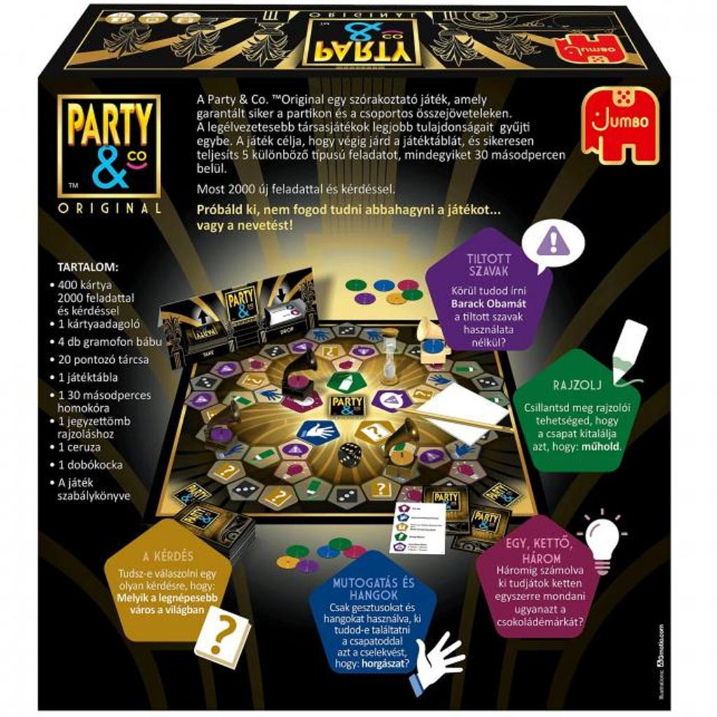 A játékmenet épít a szövetségek kialakítására, a történetmesélés varázsára, a szerepjátszás kreativitására, az éneklés vidámságára, és a ceruza-papír feladatok kihívásaira. A Party & Co Original tökéletes választás bármelyik baráti vagy családi összejövetelre, hogy azt nevetéssel és élményekkel teli estévé varázsolja.
