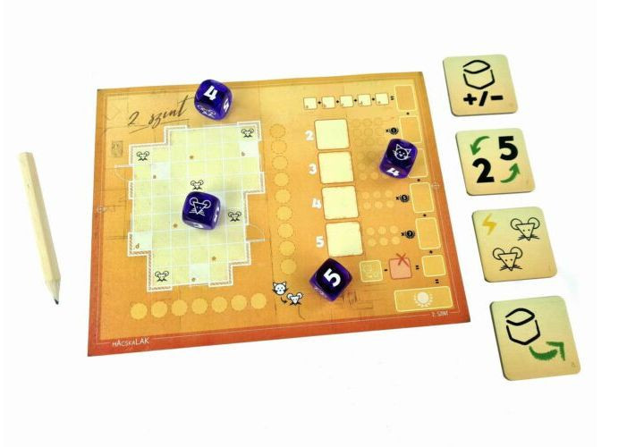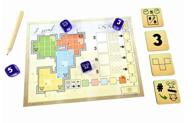 Légy részese a macskák és egerek izgalmas kalandjának a MacskaLak társasjátékban! Ebben a stratégiai játékban a játékosok dobókockák segítségével építik fel saját játéktáblájukat, ahol a taktikázás elengedhetetlen. A cél, hogy ügyesen rendezd el a számokat a játéklapodon. Minden körben egy játékos dob négy dobókockával, majd mindenki kiválaszthat hármat az eredmények közül, hogy kitöltse saját tábláját.