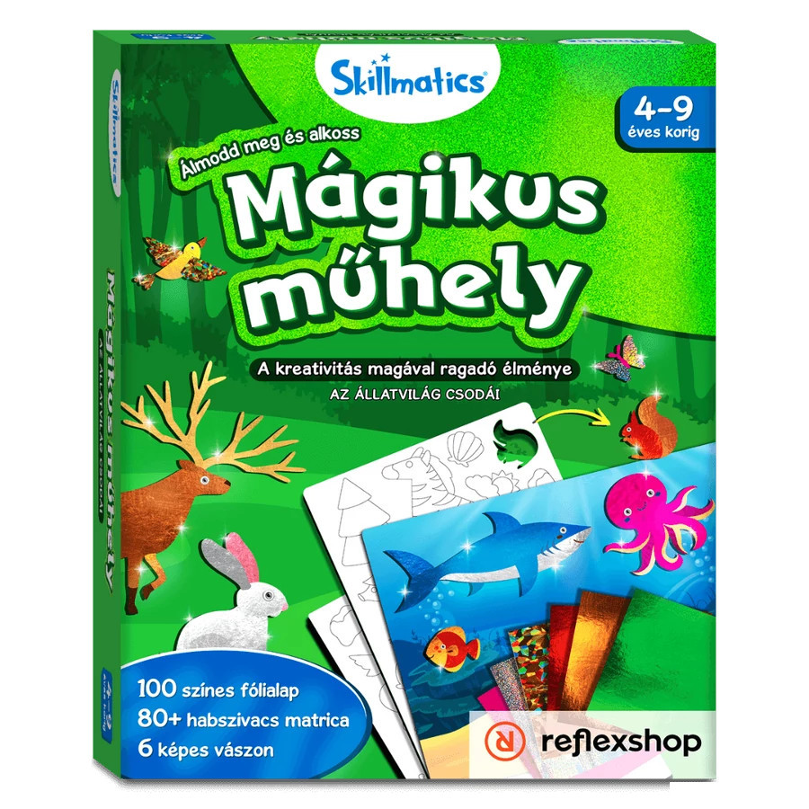 Fedezd fel a Mágikus műhely varázslatos világát, ahol a gyerekek fényes fóliákból és habmatricákból alkothatnak egyedi mesterműveket. Ébresszük fel a gyerekek kreativitását, miközben különleges megoldásokkal színezhetik ki az állatokat, az űrt és a tündérmeséket. Az egyszerű és szórakoztató használat elősegíti a finommotorika és a kéz-szem koordináció fejlődését. A csomag tartalmaz 6 ív habszivacs matricát, 6 képes vászont, 100 színes fólialapot és vicces szemeket. Készülj fel az alkotásra, ami határtalan fantáziával párosul!