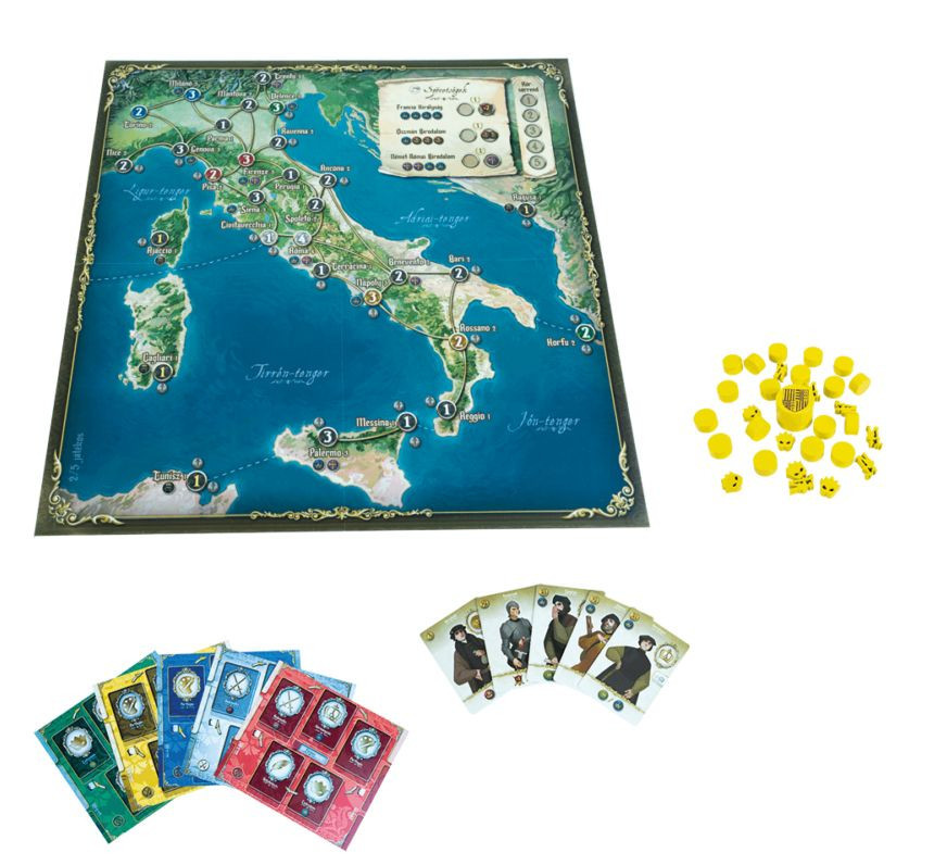 A doboz tartalma magában foglal egy kétoldalas Itália játéktáblát, központi táblákat tekintély és befolyásjelöléshez, palota játéktáblákat, lapkákat, polgárkártyákat, családkártyákat, irányítás korongokat, seregfigurákat, kémjelölőket és számos más izgalmas elemet. A játékot 2-5 fő játszhatja, a játékmenet körülbelül 30 percet vesz igénybe, és 14 éves kortól ajánlott.