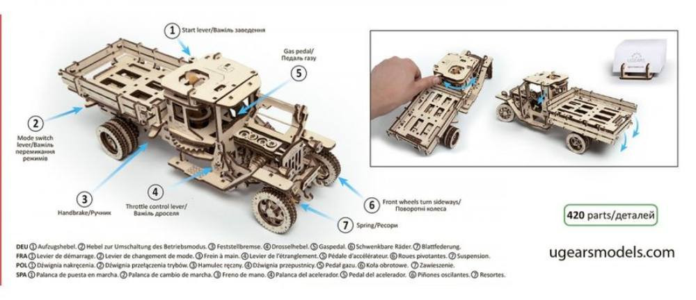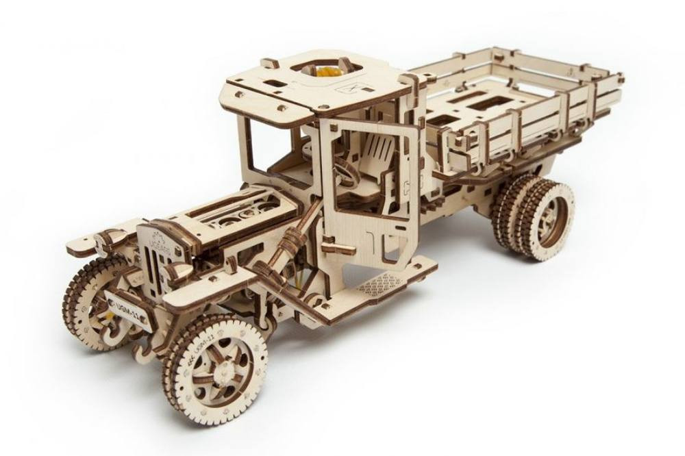 A Ugears termékek különlegessége abban rejlik, hogy az összes modell mozgatható, vagyis valamilyen funkció végezhető vele (pl. a járművek fakerekeiken guríthatók, a dobozok nyithatók-zárhatók, más modellek tekerhetők, és a lendülettől mozognak). A Teherautó modellje sem kivétel, hiszen csak fel kell húzni a kart a hátulján, sebességbe rakni, és indulhat a játék! Az utastérben egy működő kormány, egy gázpedál és egy sebességváltó is található, így az egész mechanikus működés belülről figyelhető meg.